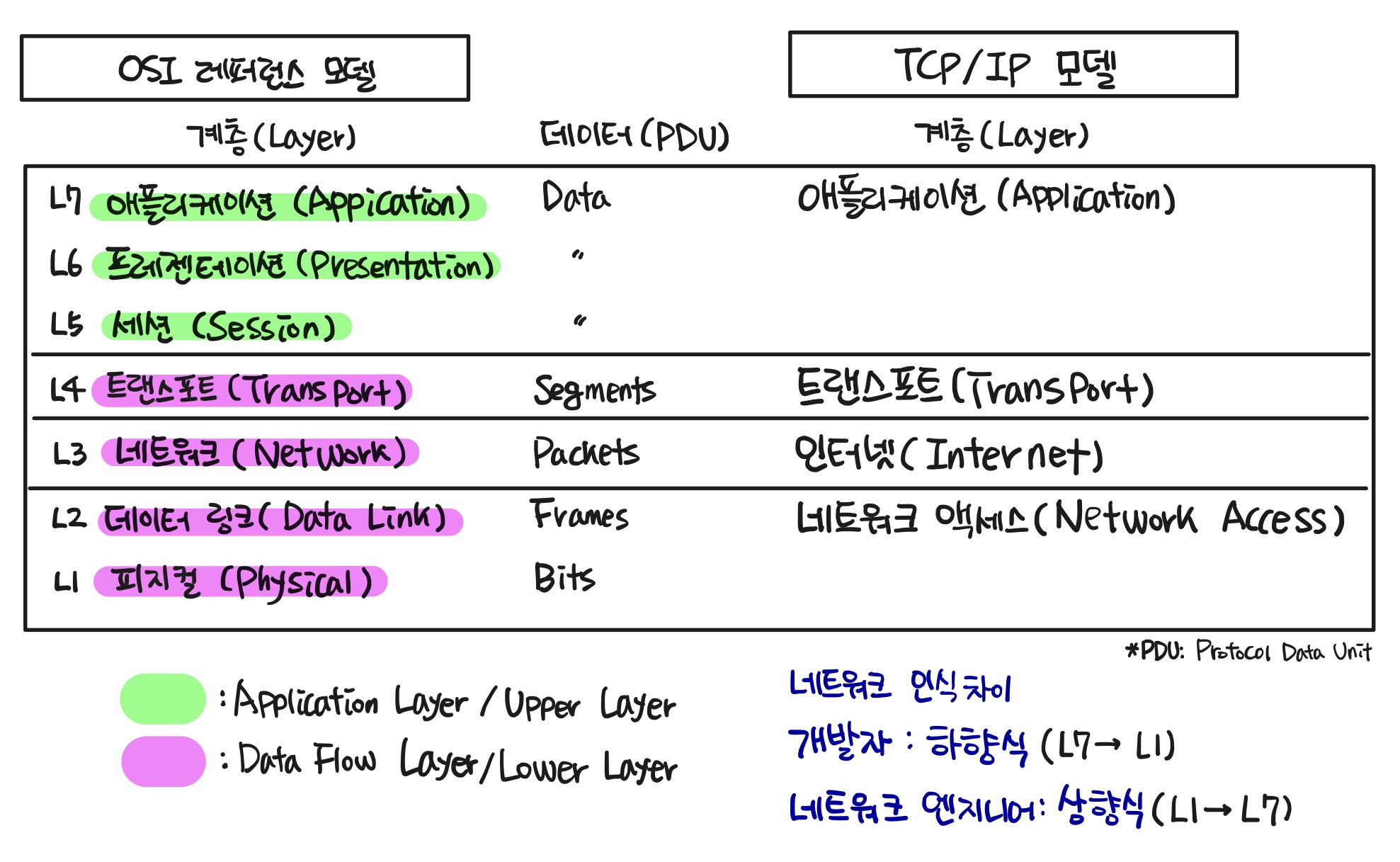 - OSI 7계층과 TCP/IP 4계층은 애플리케이션 개발자가 고려해야 할 부분과 서버 엔지니어나 네트워크 엔지니어가 고려해야 할 부분으로 구분됨