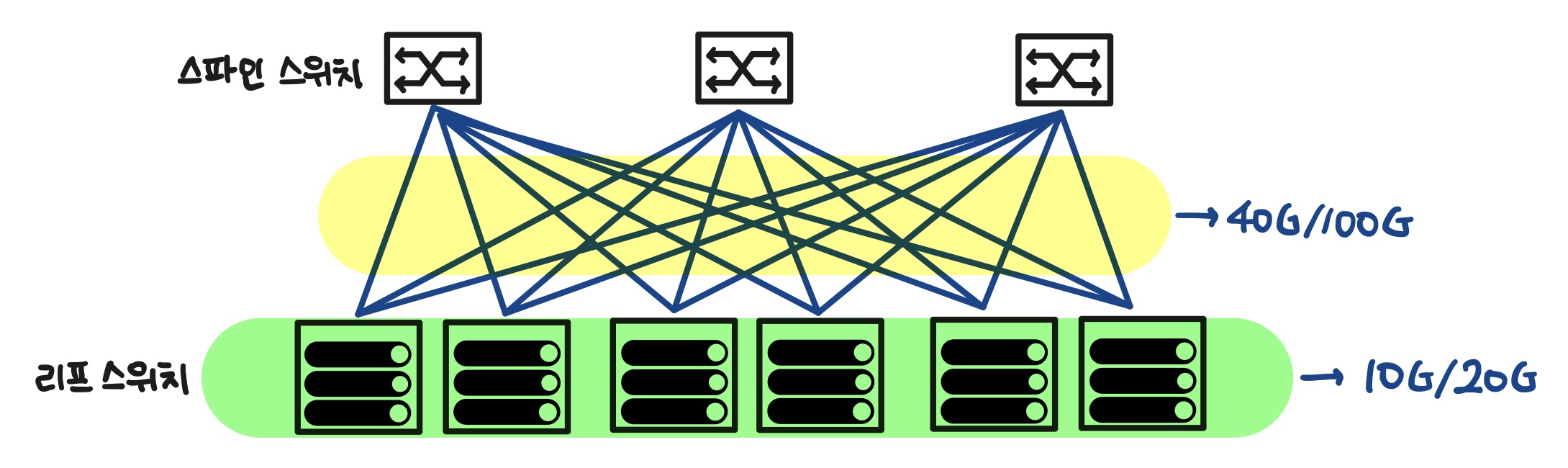 - 최근 일반 서버에 10G Base-T 이더넷 포트가 기본적으로 제공되어 TOR(Top of Rack) 스위치와 연결되고 리프(Leaf) 스위치인 TOR 스위치는 스파일(Spine) 스위치와 40G, 100G로 연결되는 추세임