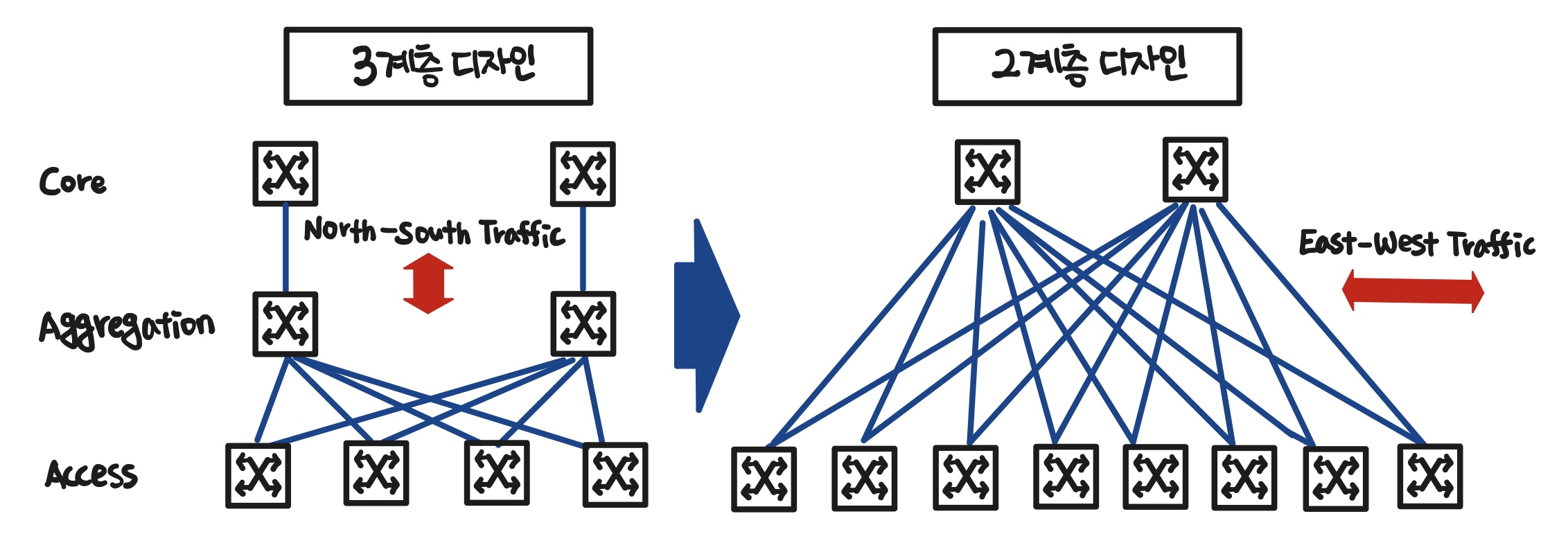 - 기존에는 3계층 구성이 일반적이었으나 스케일 아웃(Scale-OUt) 기반의 애플리케이션과 서비스의 등장으로 2계층 구성인 스파인-리프(Spine-Leaf) 구조로 변화됨