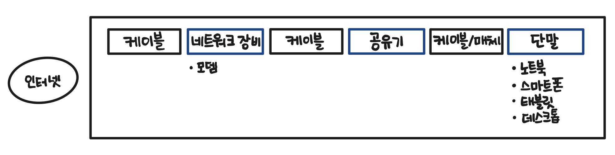 ▲ 그림 1-1. 네트워크 구성에 필요한 주요 요소들: 단말, 네트워크 장비, 케이블