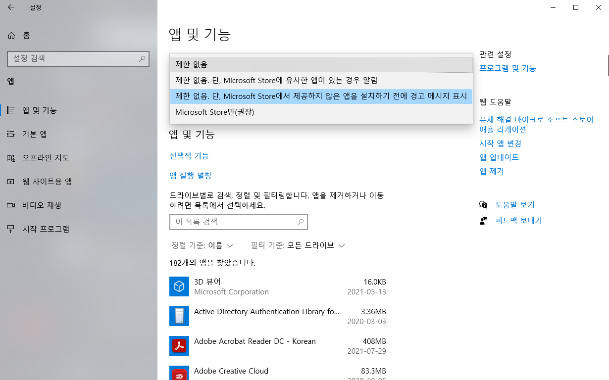 - 저의 경우에는 [제한 없음. 단, Microsoft App Store에서 제공하지 않은 앱을 설치하기 전에 경고 메시지 표시]로 되어있었습니다.