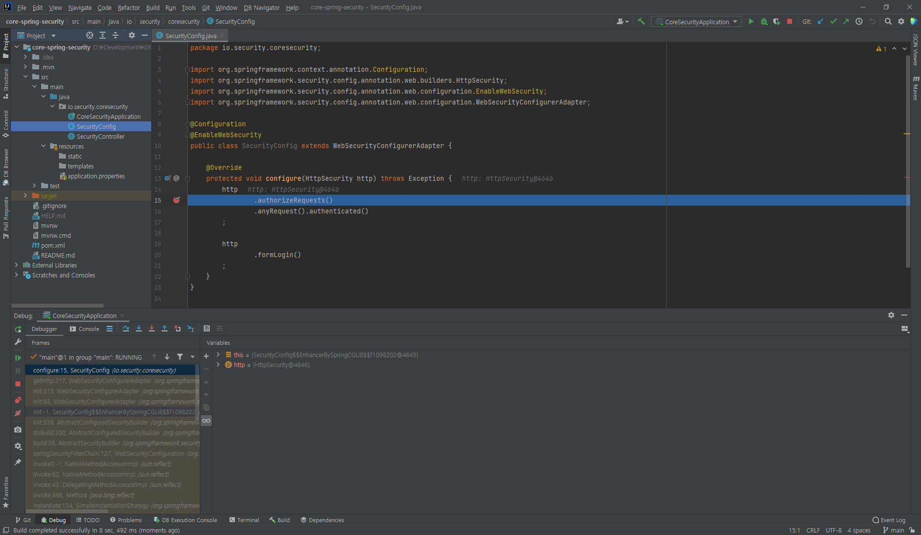 다시 서버를 기동해서 보안 인증 기능을 확인합니다. 확인되었다면 https://localhost:8080로 접속해주세요.