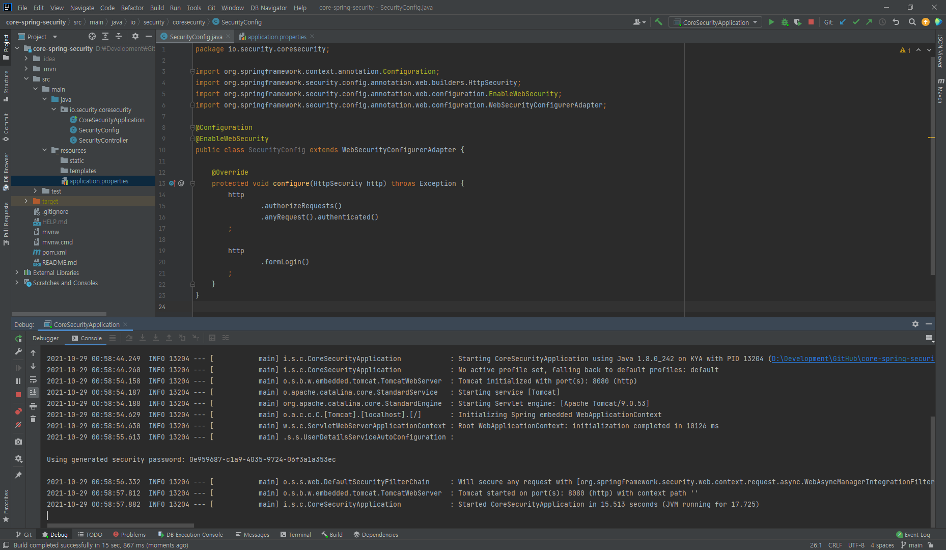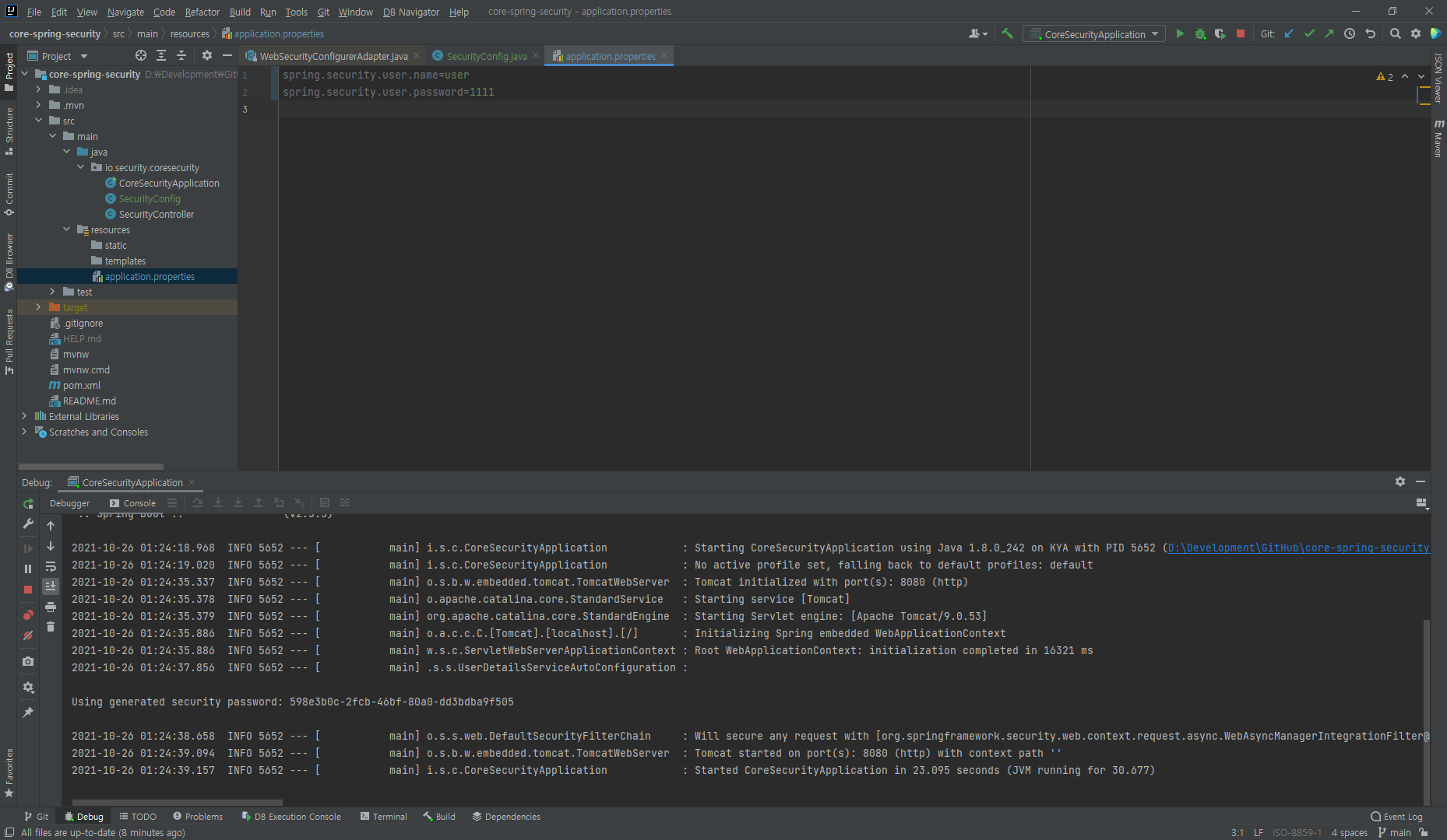 콘솔 창에 password가 있는데 계속 이런 상태로 값을 사용하기 어려우니 환경설정 파일인 application.properties로 선언해주겠습니다. 우리가 지정한 계정으로 인증할 수 있도록 설정해줍니다.
