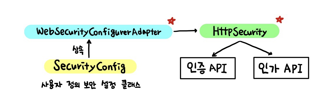 하단의 내용에서는 SecurityConfig 라는 사용자 정의 보안 설정 클래스를 만들 것입니다. SecurityConfig 클래스를 생성하여 WebSecurityConfigurerAdapter를 상속받습니다. 상속받은 클래스 중에 HttpSecurity 클래스를 파라미터로 전달받는 메소드를 오버라이드 합니다. 인증과 인가와 관련된 API를 사용할 수 있도록 보안 기능을 구현하려고 합니다.