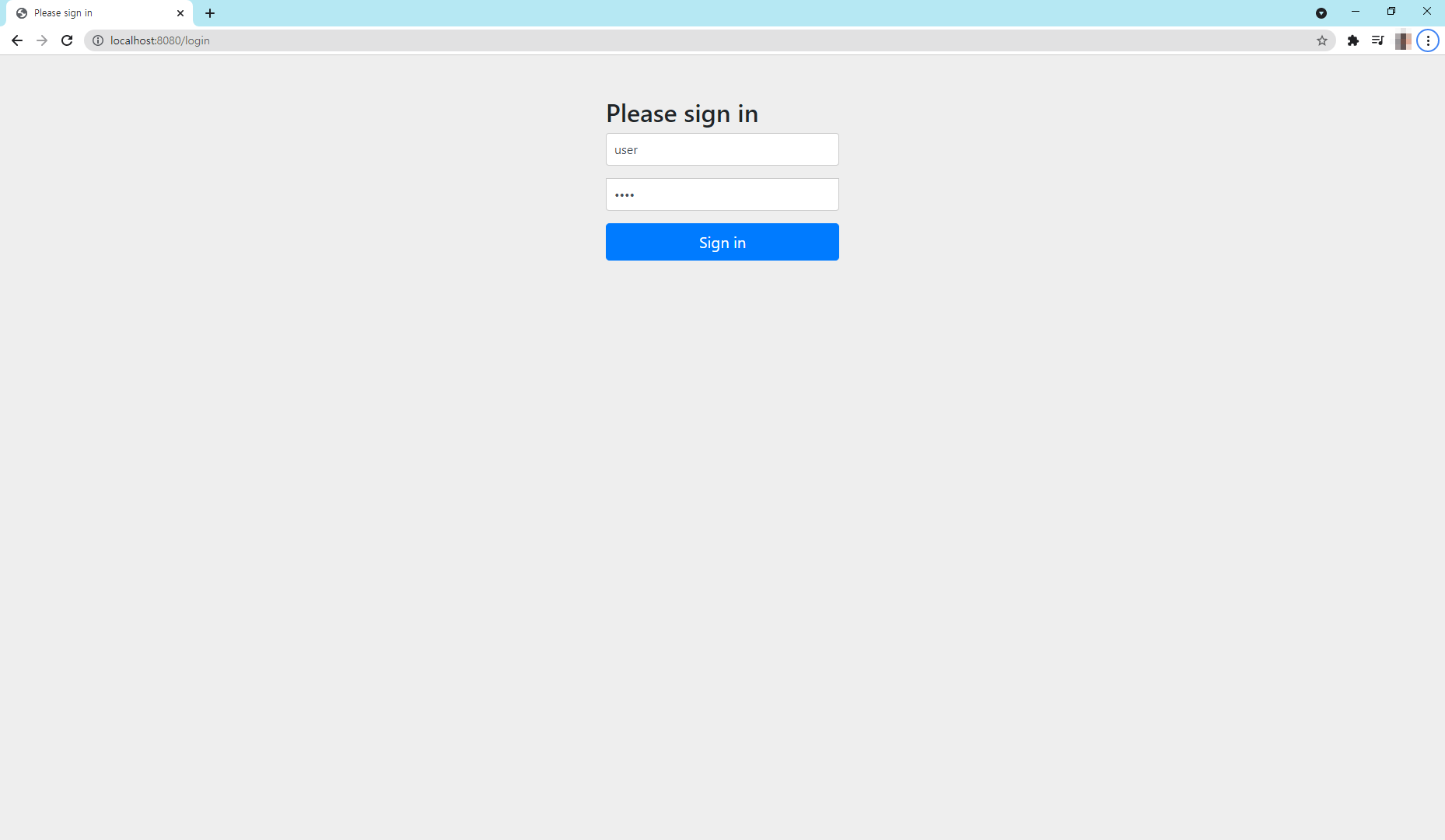 인증을 받지 않으면 루트 페이지로 접근이 되지 않는 상태입니다. 환경설정 파일(application.properties)에 작성했던 아이디와 비밀번호 값을 넣어줍니다.