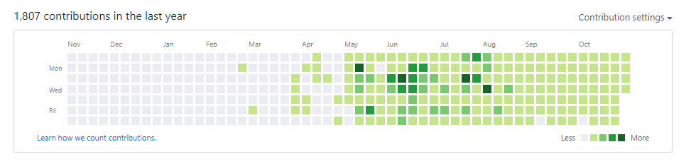 용어들에 익숙해질 때쯤 Commit 후 Master Branch에 Push하면 Contribution 영역에 초록색이 여러 가지 색깔로 칠해지는 것이 인상적이었다. Branch로 Merge하고 Rebase하고…. Branch 관련 개념이 어려워서 중간에 포기하고 싶을 때마다 나에게 강한 동기부여가 된 글이 있었는데, 이수진 님이 작성하신 깃허브로 취업하기 라는 글이었다. 이 글을 읽으며 깃허브를 이용하는 방식을 바꾸어나갔고 누군가의 1년간 Contribution 이미지가 첨부돼 있었는데, 한 해를 초록 들판으로 꽉 채운 이미지에 마음을 빼앗겼다고나 할까. 1일 1커밋을 해야겠다고 다짐하게 되었다.