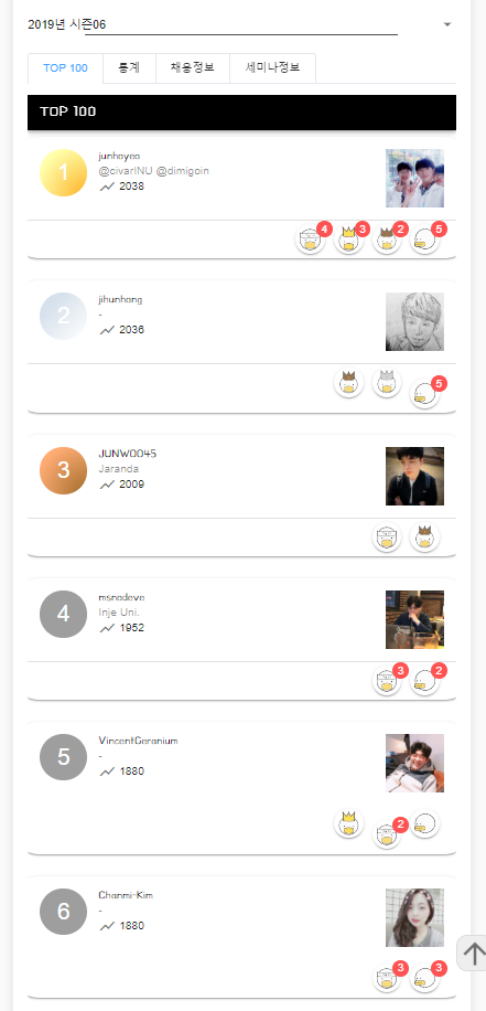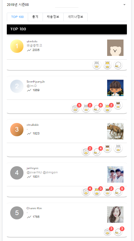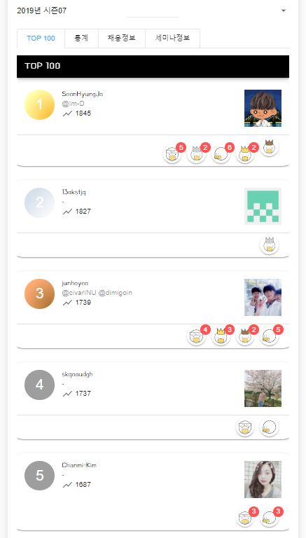 그동안 나만의 100일 프로젝트 목표를 세우고, 1일 1커밋을 제대로 실천했다. 2019년 시즌 06, 07, 08에서 3번 연속 TOP 10 순위권에 들었다. 각각 6등, 5등, 5등 이렇게 받았다. 순위권에 있다 보니 알게 모르게 모르는 분들한테 팔로워도 받았던 적도 있었다.
