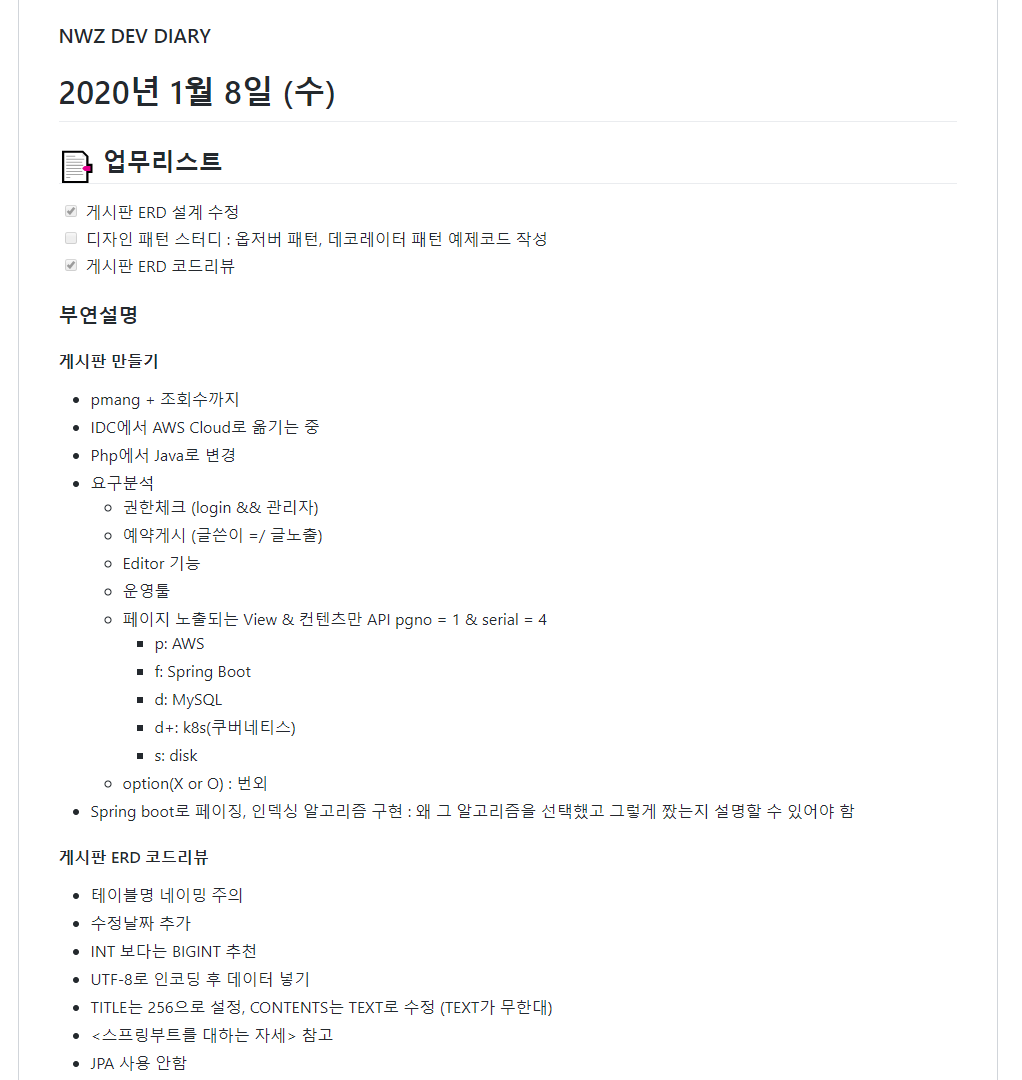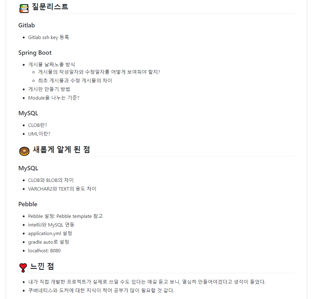 영업비밀이 포함된 내용이 있을 것 같아, 업무에 관한 이야기는 많이 생략하려고 한다. 인턴십 과제로 Spring Boot을 이용한 게시판 서비스 개발을 담당하게 되었다. 기술 스택은 주로 Spring Boot, Java, Pebble이었고, 익숙한 것을 사용해도 된다는 규정이 있어서 MySQL, MyBatis, HTML5, CSS3, JavaScript를 사용했다. 요구사항은 Step 1~3까지 있었으며, Spring Framework는 배웠지만 사실 많이 사용해보지는 않았던 터라 Spring Boot을 처음 다뤄보면서 시행착오를 겪었다. 불행히도 약 한 달 반가량을 과제를 하는 데 보냈다. 돌이켜보면 이 과정에서 체험형 인턴으로 수료할 수밖에 없었나 싶다.